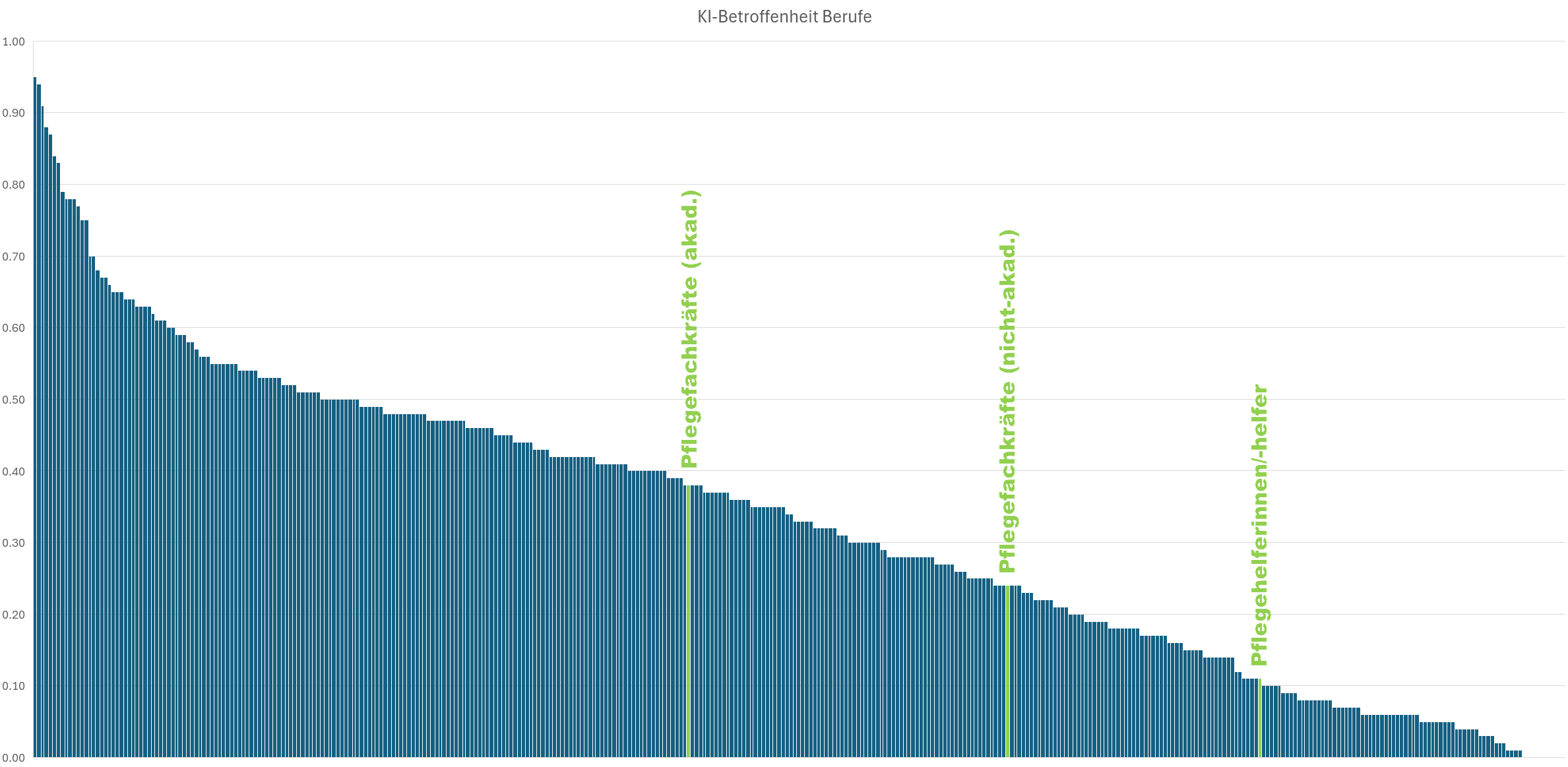 Die Pflege erweist sich in dieser Studie als ein Beruf mit Zukunft. Akademische Pflegefachkräfte befinden sich mit 0.38 im Mittelfeld, nicht-akademische Pflegefachkräfte (0.24) und Pflegehelferinnen und -helfer (0.11) im hinteren Bereich. Dies lässt sich graphisch anhand der von der NZZ publizierten Daten der ETH Zürich für die in der Spitex gängigen Berufegruppen in folgender Grafik mit 389 Berufen darstellen.